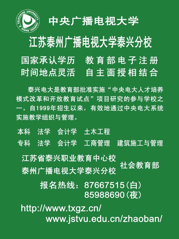 江蘇泰州廣播電視大學(xué)泰興分校招生信息