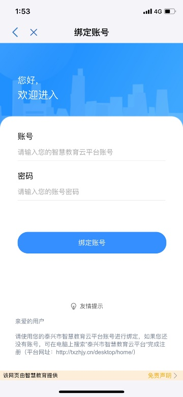情況二:用戶有泰興市智慧教育云平臺(tái)賬號,且沒有綁定應(yīng)用,進(jìn)入賬號綁定頁面,可輸入云平臺(tái)賬號和密碼,點(diǎn)擊【綁定賬號】完成綁定; 情況三:用戶有泰興市智慧教育云平臺(tái)賬號而且已經(jīng)綁定應(yīng)用,點(diǎn)擊應(yīng)用直接跳過賬號綁定頁面;