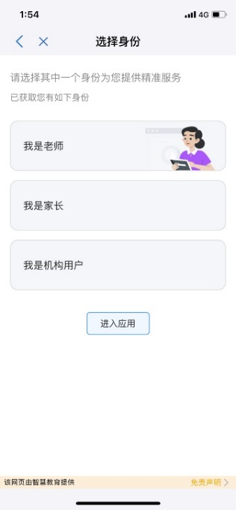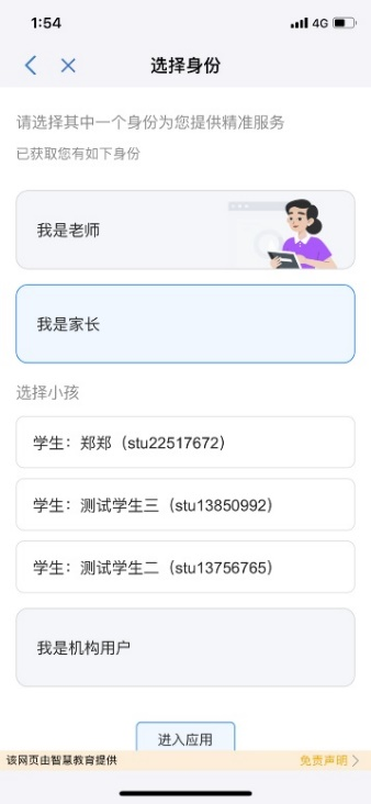 賬號綁定 選擇身份用戶登錄泰興一卡通APP,底部菜單點(diǎn)擊【生活服務(wù)】,在【校園教育】中點(diǎn)擊應(yīng)用,成功綁定賬號后,進(jìn)入選擇身份頁面,有以下兩種情況:情況一:用戶綁定的賬號有多重身份,成功綁定賬號后,進(jìn)入選擇身份頁面,用戶可選擇其中一個(gè)身份,點(diǎn)擊【進(jìn)入應(yīng)用】;情況二:用戶綁定的賬號只有一重身份,成功綁定賬號后,跳過選擇身份頁面;