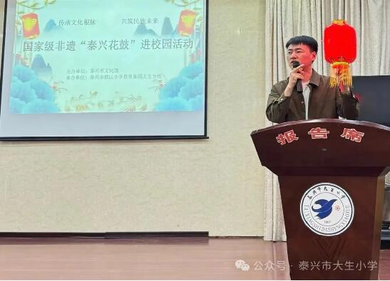 知花鼓 傳文化 “泰興花鼓”進(jìn)校園活動由小主持人對泰興市文化館的專家——“泰興花鼓”第八代傳承人胡盛主任的介紹拉開序幕。