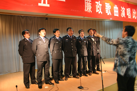 作為“五一警體周”活動的一部分,4月24日晚,泰興市公安局結(jié)合社會主義榮辱觀教育,舉辦了慶“五一”廉政歌曲演唱比賽,從而正式拉開了該局今年“五一警體周”活動的序幕。此次比賽有20多個單位、部門的140多名民警參加,比賽的優(yōu)勝單位將代表該局參加全市廉政歌曲演唱比賽。圖為市看守所民警正在演《公務(wù)員之歌》。(陸裕順)
