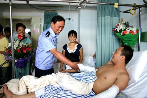 7月29日,市公安局派員專程赴浙江臺州,看望因見義勇為遭犯罪嫌疑人報復(fù)受傷的我市市民李祥,并送去了慰問金。 現(xiàn)年35歲的李祥是我市新街鎮(zhèn)李蕩村人,1993年,他帶著妻子來到浙江省臺州市路橋區(qū)打工,今年7月20日晚,李祥及時舉報并配合治安人員抓獲三名企圖實施盜竊的犯罪嫌疑人,21日晚8時被釋放的三名犯罪嫌疑人糾集十多名操外地口音的男子,對李祥連砍數(shù)刀,致其多處受傷。李祥的行為在當(dāng)?shù)匾鹆松鐣鹘绲臉O大關(guān)注,當(dāng)?shù)攸h委政府對其行為給予了高度肯定,媒體也對此事件進(jìn)行了跟蹤報道,許多當(dāng)?shù)厥忻褡园l(fā)地帶著獻(xiàn)花和捐款到醫(yī)院看望李祥。27日上午,我市公安局局長姜文湘從媒體獲知消息后,隨即派工會主席侯明德赴浙江臺州看望李祥,帶去家鄉(xiāng)人民的問候,并送去了2000元慰問金。 另據(jù)了解,李祥于2002年、2004年先后兩次見義勇為,分別被路橋區(qū)人民政府評為見義勇為先進(jìn)人物一等獎、三等獎,日前,從臺州警方傳來消息,7月30日,涉案的三名主要犯罪嫌疑人已全部落入法網(wǎng),目前,此案仍在進(jìn)一步審理中。 圖為:市公安局工會主席侯明德在醫(yī)院看望泰興的好青年李祥。 (陸裕順) |