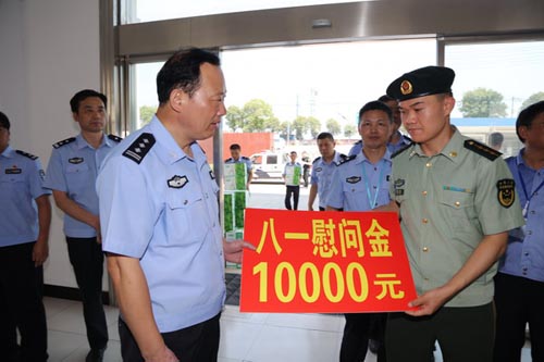 李雙山同志向武警中隊送上八一慰問金 7月28日上午,副市長、局黨委書記、局長李雙山率在家的局班子成員,先后到消防大隊、武警中隊,看望慰問堅守在高溫酷暑一線的消防、武警官兵,向他們表示親切慰問,致以節(jié)日的祝賀并送上了慰問金,對消防、武警官兵忠實履行職責,切實維護人民群眾生命財產(chǎn)安全作出的貢獻給予充分肯定,希望繼續(xù)發(fā)揚特別能吃苦、特別能戰(zhàn)斗、連續(xù)作戰(zhàn)的優(yōu)良作風,扎實工作,全力維穩(wěn),共同為泰興的經(jīng)濟發(fā)展和群眾的安居樂業(yè)保駕護航。