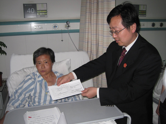 (特約記者 張鵬 胡玲)日前,泰興法院曲霞法庭法官?gòu)堸i將賠償款專程送到了當(dāng)事人張某的病床邊,原本神志不清的張某竟然流下了淚水,令在場(chǎng)的人既驚訝又感動(dòng)。 在一次交通事故中,朱某的父親不幸死亡,母親張某身受重傷,而肇事司機(jī)楊某一直拒絕支付任何費(fèi)用,朱某家人多次圍堵江平路,導(dǎo)致交通長(zhǎng)時(shí)間堵塞。該案訴至泰興法院后,承辦法官?gòu)堸i立即加班加點(diǎn)了解案情,理清法理關(guān)系,及時(shí)開庭審理。判決后,因被告楊某所承擔(dān)的賠償義務(wù)較大,高達(dá)29萬(wàn)多元,一時(shí)拿不出來(lái)這么多的錢,而朱某之母急需醫(yī)療費(fèi)。為鈍化矛盾,化解糾紛,張鵬考慮到楊某投保了商業(yè)險(xiǎn),遂主動(dòng)聯(lián)系了保險(xiǎn)公司,將商業(yè)險(xiǎn)一并理賠。經(jīng)過(guò)數(shù)次奔波和協(xié)調(diào),保險(xiǎn)公司最終將交強(qiáng)險(xiǎn)及商業(yè)險(xiǎn)所應(yīng)承擔(dān)的部分全部打至法院帳戶。因朱某之母張某一直躺在病床上,神志時(shí)常不清,辦理相關(guān)手續(xù)很不方便,張鵬便多次到醫(yī)院協(xié)助辦理手續(xù),及時(shí)將賠償款送到了朱某及其母親張某手中。 |