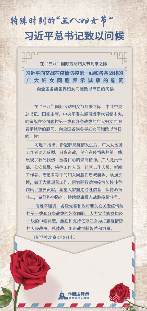 在“三八”國(guó)際勞動(dòng)?jì)D女節(jié)到來(lái)之際,中共中央總書(shū)記、國(guó)家主席、中央軍委主席習(xí)近平代表黨中央,向奮戰(zhàn)在疫情防控第一線和各條戰(zhàn)線的廣大婦女同胞表示誠(chéng)摯的慰問(wèn),向全國(guó)各族各界婦女同胞致以節(jié)日的問(wèn)候!