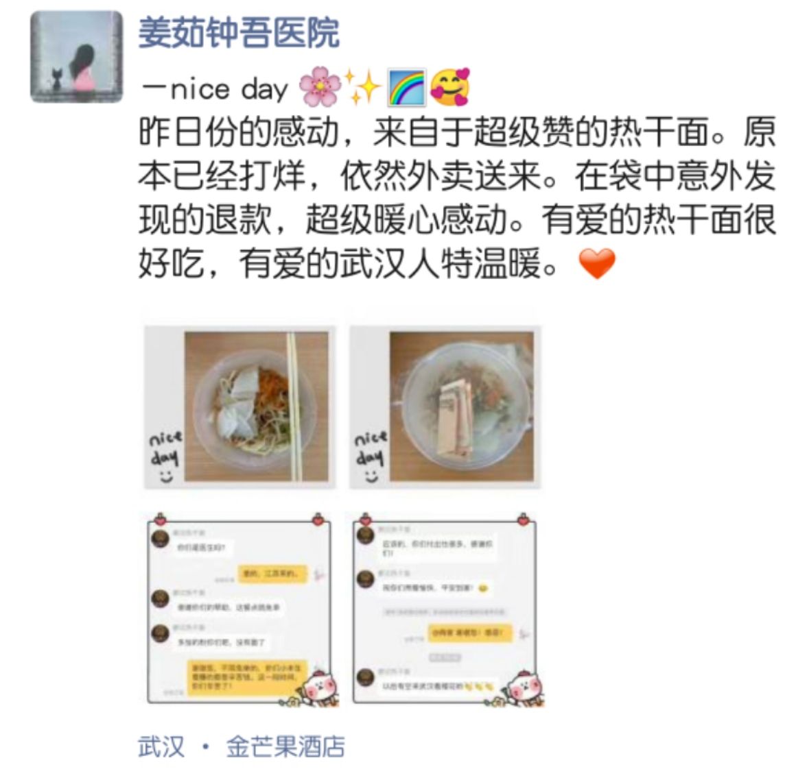 姜茹發(fā)的微信朋友圈 “那天大家商量,晚上吃熱干面,當(dāng)?shù)氐尼t(yī)生為我們推薦了一家面館。下單后,我忘記提交了。下午4點(diǎn)左右,再準(zhǔn)備付款時(shí),發(fā)現(xiàn)已經(jīng)打烊了。”3月23日上午,宿遷市鐘吾醫(yī)院醫(yī)務(wù)人員姜茹說(shuō),武漢的外賣(mài)剛剛恢復(fù)營(yíng)業(yè)不久,她想著有的商家會(huì)因?yàn)橛唵味嗝Σ贿^(guò)來(lái),店鋪會(huì)開(kāi)一會(huì)兒關(guān)一會(huì)兒。姜茹抱著試試看的心理,撥打了這家面館的電話(huà)。 “請(qǐng)問(wèn)一下,今天還有熱干面嗎?” “如果您想吃的話(huà),明天9點(diǎn)再訂哦!你們是醫(yī)生嗎?” “是的,江蘇來(lái)的!” “謝謝你們的幫助!面不多,還有粉!”