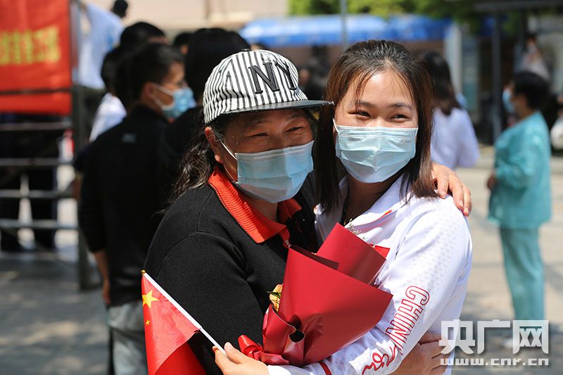 三月底,小松痊愈出院了,正在值班的趙樹林沒有見到小松,但是他通過值班手機(jī)發(fā)了一條信息,讓他的同事把信息內(nèi)容傳達(dá)給了小松。“我希望他以后學(xué)習(xí)能更上一層樓,然后未來有機(jī)會(huì)的話邀請(qǐng)他來杭州玩,我們?cè)僖娒妗,趙樹林說。 在儀式現(xiàn)場(chǎng),還有不少特地趕來與心愛的家人重聚的時(shí)刻。此次援鄂醫(yī)療隊(duì)隊(duì)員之一的92年的邵逸夫醫(yī)院下沙院區(qū)呼吸科護(hù)士羅敏就與趕來現(xiàn)場(chǎng)的媽媽擁抱見面。“在武漢連續(xù)戰(zhàn)斗的47天里,我們一直都呆在重癥監(jiān)護(hù)室里。雖然我們穿著防護(hù)服,但是病人害怕傳染給我們,當(dāng)我們送飯進(jìn)來時(shí),他們也會(huì)叫我們等等進(jìn)來,戴起口罩才開門”,羅敏說。