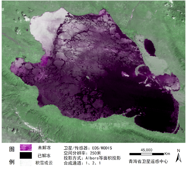 2020年4月18日青海湖開(kāi)始解凍遙感監(jiān)測(cè)圖(央廣網(wǎng)發(fā) 青海氣象供圖) 央廣網(wǎng)西寧4月20日消息(記者葛修遠(yuǎn))青海省氣象科學(xué)研究所衛(wèi)星遙感動(dòng)態(tài)監(jiān)測(cè)表明, 2020年青海湖開(kāi)始解凍期較歷年平均推遲30天。 監(jiān)測(cè)顯示,2020年4月9日,青海湖西岸泉灣、布哈河入湖口,東岸沙島、尕海的西部和東部邊緣地區(qū)出現(xiàn)零星解凍水體; 4月18日,青海湖北部湖冰大范圍破碎、東南部湖冰大范圍解凍,解凍水體面積約占主體湖總面積的35.26%,青海湖開(kāi)始解凍。2020年青海湖開(kāi)始解凍期較歷年平均推遲30天。 據(jù)青海湖周邊氣象站天峻、海晏、剛察、共和及青海湖151站點(diǎn)資料分析,4月9日以來(lái)湖體東南部氣溫升高較快、16日以來(lái)連續(xù)強(qiáng)風(fēng)天氣是導(dǎo)致4月18日青海湖東南部湖冰大范圍解凍的主要因素;前期氣溫偏低、風(fēng)速偏小是造成2020年青海湖開(kāi)始解凍期較歷年推遲的主因。 |
