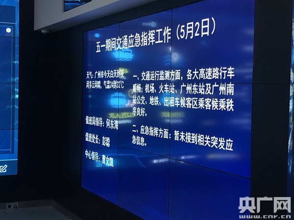 廣州市交通信息指揮中心。(央廣記者 廖開迪 攝) 廣州市交通信息指揮中心工作人員陳宇興表示,廣州市交通運輸部門預(yù)測返程高峰將會出現(xiàn)在假期第四日(5月4日)15時-21時,假期第五日(5月5日)13時-23時兩個時段。 “這兩個返程高峰中,我們預(yù)測假期第五日(5月5日)返程客流、車流量最大。在此,我們提醒廣大市民和旅客在五一假期出行時要科學(xué)規(guī)劃好行程,錯峰出行;同時,持續(xù)強化自我防護意識,出門佩戴好口罩,服從現(xiàn)場工作人員的指引,安全有序出行! 為滿足市民出行和返程客流需要,針對預(yù)測的返程高峰,廣州地鐵將于5月3日至5日,每天延長地鐵二號線廣州南站往嘉禾望崗方向運營服務(wù)時間30分鐘,同時,還將根據(jù)相關(guān)站點客流變化情況,適時組織采取疏導(dǎo)管控措施、調(diào)整運輸組織方式。 公交方面,市交通運輸部門將進一步強化廣州塔、花城廣場、體育中心等各大旅游景點與商業(yè)區(qū)域途經(jīng)公交線路運營服務(wù),加密班次、適當延長服務(wù)時間,保障市民公交出行需求。 |