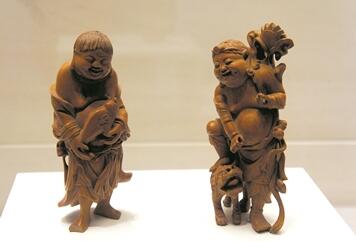 明清時期,民間文物上的“微笑”元素俯拾皆是。南博雕塑館陳列的一對明清木雕“和合二仙”洋溢著歡樂的氣氛。由寒山拾得演變而來的“和合二仙”多以快樂的面目出現(xiàn),是蘇州刺繡、無錫泥人等江蘇非遺藝術(shù)中常用的創(chuàng)作題材。在南京的高淳博物館,記者見到了一件“春風(fēng)得意馬蹄疾”的磚雕,這幅畫面出自唐代詩人孟郊《登科后》的詩句“春風(fēng)得意馬蹄疾,一日看盡長安花”?茍鲞B捷的主人公走上了人生巔峰,縱馬馳騁,開懷大笑。保留在江南各地的大量明清古建筑的石雕、磚雕、木雕上,有很多類似的吉祥圖案,“微笑”畫面比比皆是,表達(dá)了古代江蘇人對生活美滿、諸事順心的期盼和祝愿。