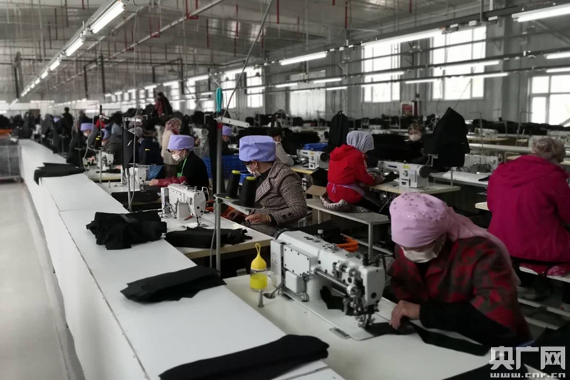 生產(chǎn)口罩的扶貧車間(央廣網(wǎng)記者 廉軍 攝) 記者近日來到固原市賢倫服飾公司的扶貧車間采訪,公司法人鄭賢倫表示,公司加工服裝車間這幾年用工一直穩(wěn)定在400人左右,每年支付工人工資都在上千萬元,從來沒有拖欠過。在車間里記者了解到,工人基本上都是家在附近的農(nóng)村婦女,年齡從18歲到50多歲都有,月收入平均3000多元,最高的拿到8000多元。幾位工人都表示在家門口務工可以兼顧家里的孩子和老人。