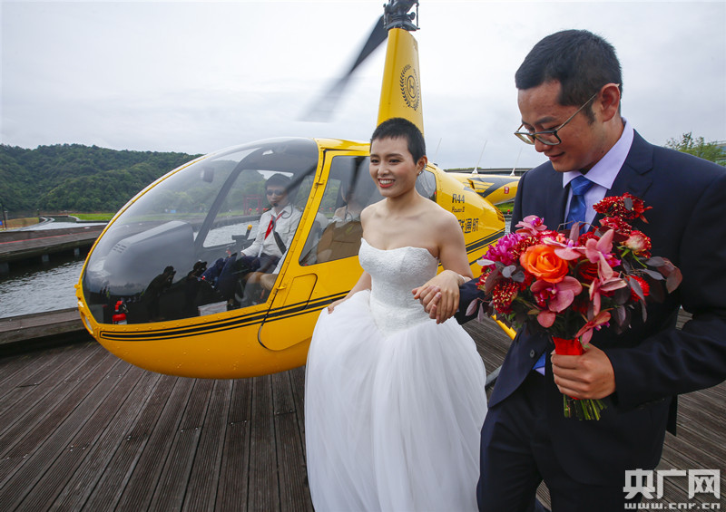 浙江省淳安縣今天為戰(zhàn)“疫”情侶代表舉辦空中婚禮(央廣網(wǎng)發(fā) 王建才 攝) 在新冠病毒肆虐的初春,為抗擊疫情,許多醫(yī)護青年主動推遲了自己的婚期,全力投身抗疫一線。今天的空中婚禮寓意“白衣天使”歸來。六位新娘身穿潔白的婚紗,乘坐直升機來到新郎身邊。