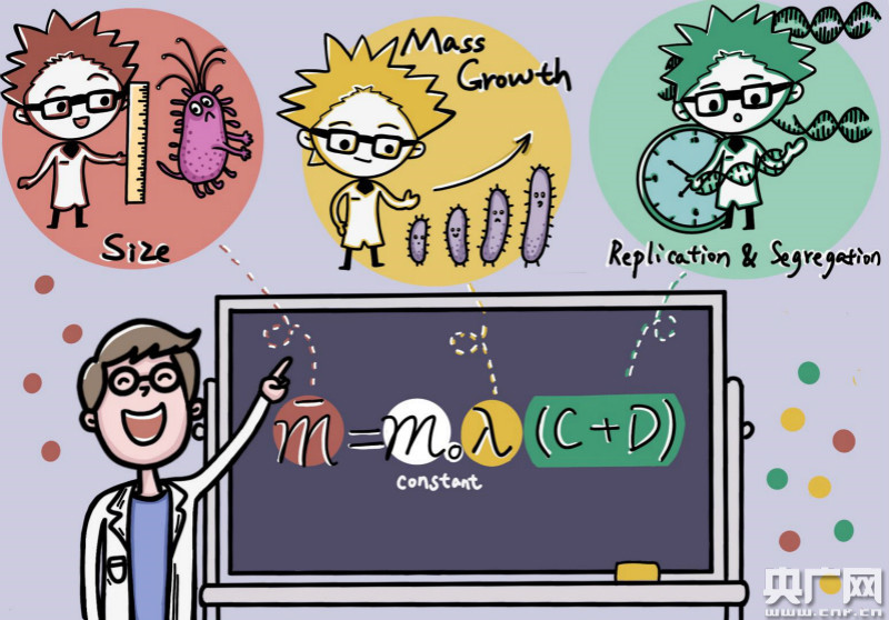 個體生長分裂方程示意圖(央廣網(wǎng)發(fā) 深圳先進院供圖) 新的方程統(tǒng)一了不同生長速率條件下的細菌細胞周期調(diào)控機制,這一定量公式的提出也使得細菌個體大小、生長速率等自然現(xiàn)象具有了一定的可預(yù)測性。例如:當(dāng)?shù)弥毦L速率和DNA復(fù)制周期,便可準確預(yù)測出細菌的大小。該分裂方程為研究人員提供新的研究范式和思維方法,解答細菌細胞大小和DNA復(fù)制周期以及生長速度之間的關(guān)系,并具有廣泛的應(yīng)用價值。 “個體生長方程”對理解細菌細胞周期的控制機制有什么意義呢?在“個體生長方程”的約束下,研究團隊對細菌細胞分裂的控制機制進行了探討,并以此為基礎(chǔ)提出了一個全新的分子機制假說,認為存在一種“分裂許可物”,它與“細胞生長”和“染色體復(fù)制分離”相關(guān)。當(dāng)它積累達到一定閾值時,細胞就會分裂。研究團隊在此基礎(chǔ)上建立了相應(yīng)的數(shù)學(xué)模型,進一步的實驗確實驗證了理論預(yù)測。 從數(shù)學(xué)公式到建構(gòu)生命體理性設(shè)計基礎(chǔ) 在物理世界,“伯努利方程”指導(dǎo)了飛機的設(shè)計,“阿基米德浮力定律”推動了潛艇的面世,“牛頓第二定律”是人類得以翱翔太空的理論基石,合成生物學(xué)的終極目標(biāo)就是生物世界實現(xiàn)理性設(shè)計、改造現(xiàn)有生命形式或者創(chuàng)造全新的生命形式以滿足人類不同的需求。 以“合成生物學(xué)”為研究導(dǎo)向,劉陳立團隊繼去年揭示細菌群體遷徙公式后,該研究是在定量生物學(xué)領(lǐng)域的再度突破,“研究再次證實了定量的思維方法在生命科學(xué)研究中的重要性,我們找到的每一個運行規(guī)律,都是試圖找到可用于指導(dǎo)設(shè)計、改造、重建生命形式的‘圖紙’!眲㈥惲⒈硎。此次對細菌個體細胞相關(guān)定量規(guī)律和法則的基礎(chǔ)科學(xué)問題研究,對人類揭示并理解生命體內(nèi)在原理提供了重要的參考依據(jù),此研究也有助于未來合成生物學(xué)領(lǐng)域的理性設(shè)計和建構(gòu),以滿足細菌治療疾病、抗生素替代、綠色生物制造等多個應(yīng)用層面的需要。 |