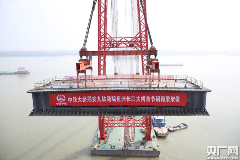 鳊魚洲長江大橋首節(jié)鋼梁架設(shè)現(xiàn)場(央廣網(wǎng)發(fā) 通訊員熊旺平 提供) 安九鐵路鳊魚洲長江大橋由武九鐵路客運專線湖北公司承建、中鐵大橋院設(shè)計、中鐵大橋局施工。大橋為4線鐵路大橋,其中兩線為高鐵線,時速350公里;預(yù)留兩線為客貨線,時速200公里。其中南汊航道橋全長1320米,為主跨672米的雙塔雙索面交叉索斜拉橋。