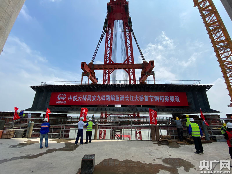 鳊魚洲長江大橋首節(jié)鋼梁架設(shè)現(xiàn)場(央廣網(wǎng)發(fā) 通訊員熊旺平 提供) “南汊航道橋橋位處船只往來頻繁,為盡量減少對航道影響,大橋主梁采用大節(jié)段鋼箱梁整體架設(shè)方案!敝需F大橋局安九鐵路鳊魚洲長江大橋項目部總工程師汪芳進(jìn)告訴記者,目前國內(nèi)大跨度鐵路斜拉橋主梁以鋼桁梁居多,但鋼箱梁施工速度更快,且材料更省,易于維護(hù),能夠最大限度地降低對高速鐵路運營影響,這也是國內(nèi)首次在這種跨度的鐵路斜拉橋主梁中選用鋼箱梁。