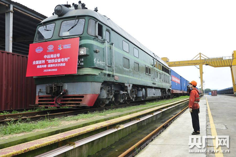 “地鐵施工設(shè)備專列”中歐班列從南昌向塘國(guó)際陸港發(fā)出(央廣網(wǎng)發(fā) 通訊員供圖) 央廣網(wǎng)南昌6月8日消息(記者謝元森 通訊員李慳)6月8日,一趟滿載著大型地鐵地下施工專用設(shè)備的中歐班列專列從南昌向塘國(guó)際陸港駛向俄羅斯莫斯科,這是全國(guó)開行的首趟地鐵施工設(shè)備專列,也是南昌向塘國(guó)際陸港繼食品專列、防疫物資專列之后又一定制專列。