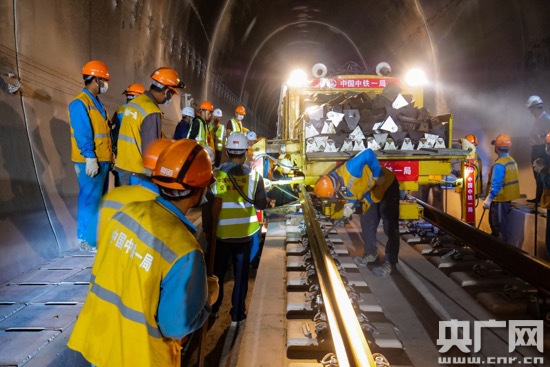 大臨鐵路正式鋪軌(央廣網(wǎng)發(fā) 通訊員供圖) 中國鐵路昆明局集團(tuán)滇西鐵路建設(shè)指揮部副指揮長馬建華介紹,為克服疫情影響,確保按時(shí)保質(zhì)保量完成任務(wù),鐵路部門組織各參建單位按照“大干100天,決勝大臨鐵路”的目標(biāo),加班加點(diǎn)趕進(jìn)度,全力推進(jìn)剩余工程建設(shè)。截至目前,全線隧道工程已完成設(shè)計(jì)總量的97.5%,橋梁完成97.9%,路基土石方97.6%。