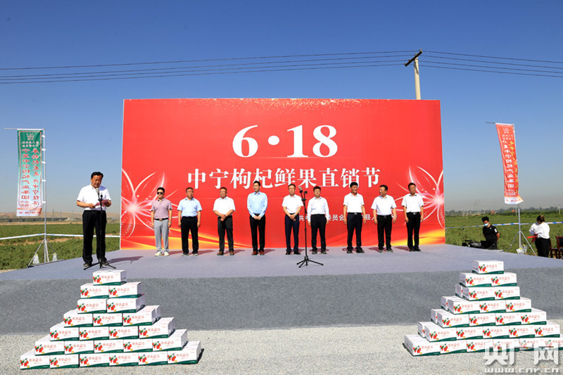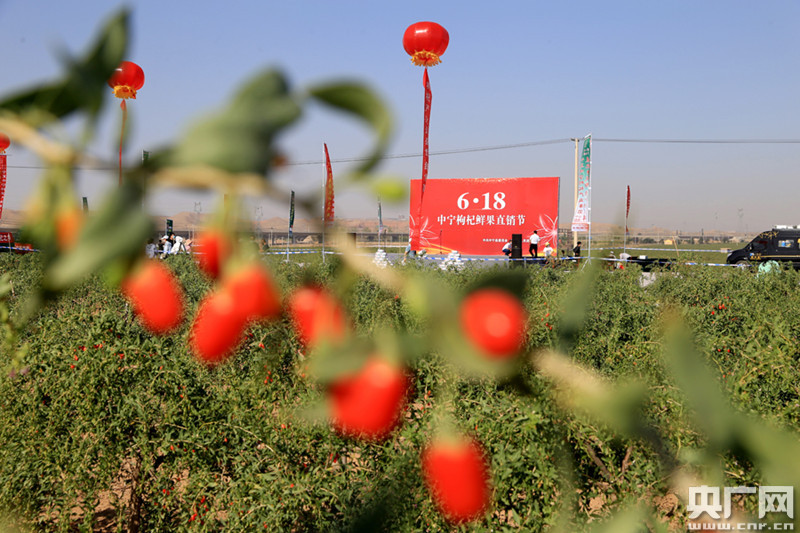 火紅枸杞映襯中的6.18活動(央廣網(wǎng)發(fā) 通訊員張潔龍 攝) 央廣網(wǎng)銀川6月18日消息(記者徐升)今天,“6·18”中寧枸杞鮮果直銷節(jié)在寧夏中寧縣啟動。中寧縣委書記陳宏做客線上直播間與主持人共同推介中寧枸杞,超過70多萬網(wǎng)友進入直播間觀看了線上直播活動。