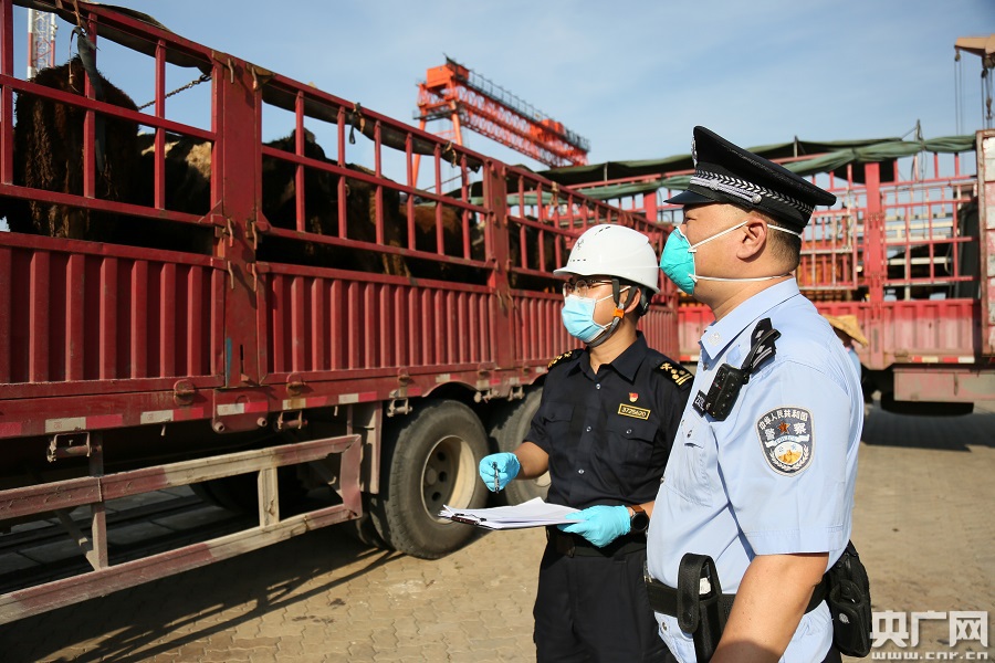 現(xiàn)場接卸活牛(央廣網(wǎng)發(fā) 祝婕女?dāng)z) 針對(duì)該輪載運(yùn)時(shí)間長、搭載人員數(shù)量多、口岸限定區(qū)域接卸貨車多的實(shí)際情況,廈門東渡出入境邊防檢查站提前核查船舶軌跡,篩查船員信息,實(shí)時(shí)與海關(guān)互通信息,協(xié)助做好現(xiàn)場圍欄設(shè)置和場所消殺,著力降低疫情輸入風(fēng)險(xiǎn)。該輪靠泊完成檢疫程序后,又迅速派出3名骨干民警,穿戴高等級(jí)防護(hù)裝具,登輪開展人證對(duì)照等邊防檢查工作,并第一時(shí)間辦理入境邊檢手續(xù)和行政許可審批手續(xù),最大程度壓縮減少船舶候檢時(shí)間,避免活牛因高溫中暑造成死亡,確保疫情不入、卸貨不緩。 |