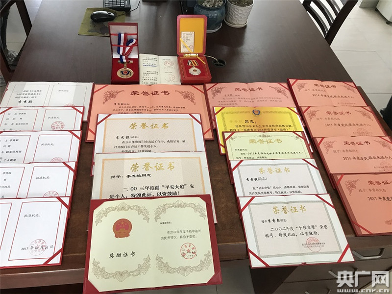 李秀毅生前獲得的部分榮譽(yù)獎(jiǎng)?wù)潞妥C書(央廣網(wǎng)記者陳庚 攝) 在李秀毅和同事們的努力下,如今,廈門市公安局同安分局交警大隊(duì)新民中隊(duì)轄區(qū)道路交通狀況明顯好轉(zhuǎn),以最復(fù)雜的工業(yè)區(qū)為例,交通亡人事故從2018年的15起15人,下降到2019年的5起5人,今年上半年,僅1起1人。 從警25年來,李秀毅先后7次榮獲個(gè)人嘉獎(jiǎng)、4次獲評(píng)“愛民敬業(yè)先進(jìn)個(gè)人”,還被評(píng)為廈門市優(yōu)秀人民警察。他的同事們說,他把許多榮譽(yù)都讓給了別人,他實(shí)際應(yīng)得的不只這些。 |