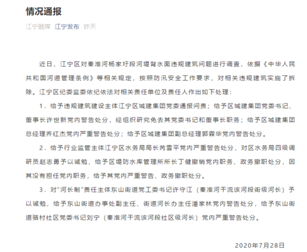 南京江寧紀(jì)委監(jiān)委對秦淮河河堤違建涉事責(zé)任單位和責(zé)任人予以處理