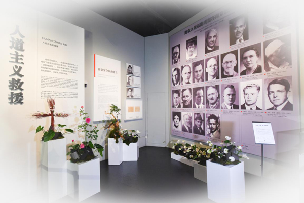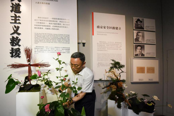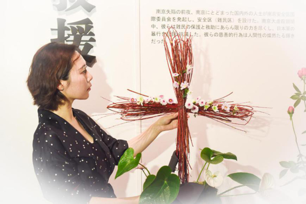 “花語(yǔ)”訴和平。(蔡美婷 攝) 上午9點(diǎn),活動(dòng)在紀(jì)念館史料陳列廳“人道主義救援”展區(qū)舉行。展區(qū)前設(shè)著幾張花臺(tái),花臺(tái)上,破碎的瓦片覆蓋著碧綠的苔蘚,在瓦片的縫隙中,白掌參差錯(cuò)落,綠松傲然挺立,用紅端木制作的“紅十字”裝置肅立在展區(qū)入口。儀式中,侵華日軍南京大屠殺遇難同胞紀(jì)念館館長(zhǎng)張建軍將一束粉色的和平月季置于盆景中,整部象征和平的花語(yǔ)作品宣告完成。