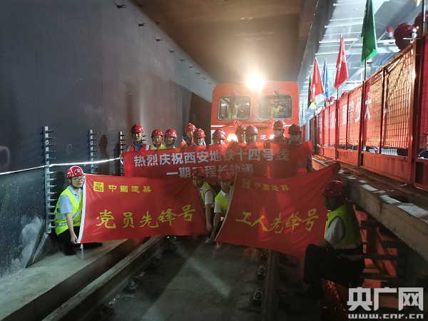 西安地鐵14號線一期工程軌通儀式在雙寨站舉行(央廣網記者 溫超 攝) 作為十四運重點交通配套工程,西安地鐵14號線西起北客站(北廣場),東至國際港務區(qū)賀韶村站,線路全長13.7公里,均為地下線,途經未央?yún)^(qū)、浐灞生態(tài)區(qū)、國際港務區(qū),設車站8座,其中換乘站3座。全線建成后,西安地鐵14號線將成為連接起機場和西安北站兩大交通樞紐及奧體中心的快速通道,實現(xiàn)真正意義上空港、高鐵和陸港的串接效果。 中建安裝西安市地鐵十四號線項目經理惠晨介紹,地鐵14號線軌道線路下穿灞河,是西安市首次下穿富水層河道及首次采用冷凍法進行區(qū)間聯(lián)絡通道施工的軌道線路,是全線軌道工程的最大難點區(qū)域。為了加速項目建設進程,采取盾構正線與聯(lián)絡通道同步、聯(lián)絡通道與軌道同步的施工策略,采用“1機鋪+2散鋪”以及24小時3班作業(yè)的施工安排,實現(xiàn)了日均鋪軌140米、最高紀錄200米的成績。