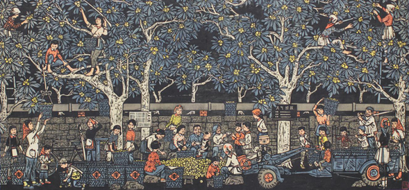 版畫 《五月枇杷滿樹》 楊明義 據(jù)悉,此次展覽在館藏作品中遴選出創(chuàng)作于上個世紀(jì)五六十年代至今的版畫和中國畫作品120幅,將分為砥礪奮進(jìn)、美好生活和綠水青山三個版塊,主要立足于對館藏中國畫和版畫經(jīng)典美術(shù)作品的梳理,遵循時代、歷史和美學(xué)的線索,見微知著,全方位地呈現(xiàn)社會奮進(jìn)、祖國河山和人民生活的各個方面。 在江蘇省美術(shù)館館長徐惠泉看來,其中有些作品以大尺幅、大構(gòu)圖著眼于表現(xiàn)水利建設(shè)、鋪路架橋、航天工程等宏大敘事;有些則以小見大,聚焦于農(nóng)家豐收、慶賀新居、老有所樂等平凡瞬間;有些則直抒胸臆,記錄于松竹林茂、煙云縹緲、鳥啼蟬鳴等生態(tài)景觀,共同勾勒出社情人文的時代變遷。