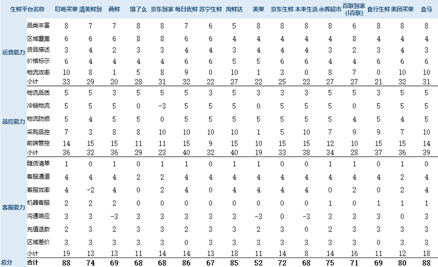2020上海線上生鮮平臺(tái)消費(fèi)評(píng)價(jià)總分排名(上海市消保委供圖) 據(jù)悉,本次消費(fèi)評(píng)價(jià)工作選取了16家有代表性的線上生鮮平臺(tái),通過(guò)模擬普通消費(fèi)者在線上生鮮平臺(tái)購(gòu)買(mǎi)生鮮商品開(kāi)展工作,并主要圍繞運(yùn)營(yíng)能力、品控能力、客服能力三個(gè)維度進(jìn)行評(píng)價(jià)。