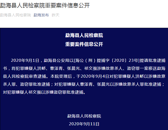 圖為官方通報。勐?h委宣傳部官方微信公眾號截圖 通報稱:2020年9月1日,勐?h公安局以[海公(刑)提捕字〔2020〕23號]提請批準逮捕書,將犯罪嫌疑人洪嶠、曹澤青、張晨光、祁文強涉嫌故意殺人、盜竊罪一案移送勐?h人民檢察院審查逮捕。 勐?h人民檢察院受理后,于2020年9月4日對犯罪嫌疑人洪嶠以涉嫌故意殺人罪、盜竊罪批準逮捕;對犯罪嫌疑人曹澤青、張晨光以涉嫌故意殺人罪批準逮捕;對犯罪嫌疑人祁文強以涉嫌盜竊罪批準逮捕。 此前,勐?h公安局于8月4日通報稱,李某月從江蘇南京到達云南勐海后去向不明。初步查明,犯罪嫌疑人洪某與張某光、曹某青在南京合某,張某光、曹某青前往勐海縣于7月9日晚將李某月誘騙至該縣城郊外的山林中殺害并埋尸。 (杜瀟瀟) |