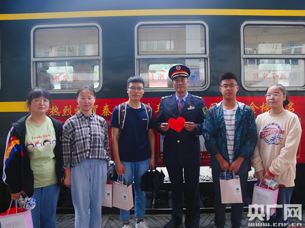 列車工作人員為大學(xué)生佩戴上大紅花(央廣網(wǎng)發(fā) 通訊員張雁南 攝) “因?yàn)榻衲暌咔榈脑,讓我萌發(fā)了學(xué)醫(yī)的念頭,最終也如愿被西安醫(yī)學(xué)院錄取了!碑(dāng)被問到高考志愿是如何選擇時(shí),家住馬蹄灣鎮(zhèn)的梁欣瑤平靜地說道,“當(dāng)學(xué)有所成時(shí),我還會回到秦嶺,用學(xué)到的知識報(bào)效祖國,為家鄉(xiāng)的建設(shè)貢獻(xiàn)自己的力量! “向叔叔,梁佳走之前寫了封信讓我?guī)Ыo您!迸R近略陽車站,封清杰找到向?qū)毩周囬L,遞上了一張心形卡片。家在白水江鎮(zhèn)的梁佳今年也考上了西安外國語大學(xué),原本和同學(xué)約好再坐一次小慢車,可因?yàn)榕R時(shí)有事便提前去了西安,臨走前,她便托同學(xué)給向車長帶來一封信。