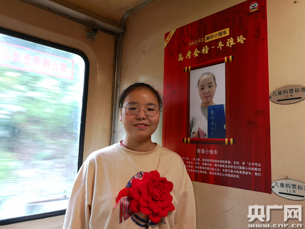 公益慢火車的乘客車雅玲如愿考上大學(xué)(央廣網(wǎng)發(fā) 通訊員張雁南 攝) “孩子們,今年我們小慢車的通學(xué)學(xué)生里,有7人考上了大學(xué),現(xiàn)在讓我們揭開‘高考金榜’,一起來看看他們都是誰。”列車從馬蹄灣站開車后,6063次列車長向?qū)毩忠贿呎f著一邊揮手掀開了紅綢,只見一張紅紙金字的“高考金榜”展現(xiàn)在所有人眼前,上面7名“準(zhǔn)大學(xué)生”拿著錄取通知書喜笑顏開的照片吸引了所有人的注意。 “封清杰考上西安工業(yè)大學(xué),高璇考上了西安外國語大學(xué),梁欣瑤被西安醫(yī)學(xué)院錄取……”向?qū)毩周囬L念著榜單,受邀來到車上的5名“準(zhǔn)大學(xué)生”依次走上前,列車工作人員為他們佩戴上大紅花,“通學(xué)車廂”還為他們準(zhǔn)備了鋼筆、筆記本等學(xué)習(xí)用品作為禮物。最讓孩子們暖心的是,列車工作人員發(fā)現(xiàn)他們?nèi)伎忌狭宋靼驳脑盒,便特意為他們辦了西安的“長安通”乘車卡,初到西安,孩子們坐地鐵、公交就一下子方便了很多。最后,封清杰、車雅玲作為代表,還對車廂內(nèi)的學(xué)弟學(xué)妹們講述了高考心得、傳授了學(xué)習(xí)經(jīng)驗(yàn),并送上了自己對弟弟妹妹們最美好的祝愿。