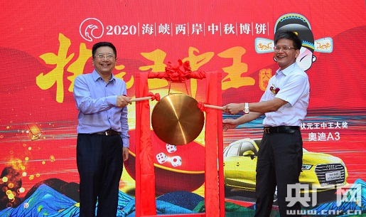 國務(wù)院臺(tái)辦新聞局局長(zhǎng)馬曉光(左),福建日?qǐng)?bào)副總編輯潘賢強(qiáng)為比賽開鑼(央廣網(wǎng)發(fā) 主辦方供圖) 央廣網(wǎng)廈門9月22日消息(記者陳庚)2020海峽兩岸中秋博餅狀元王中王大賽20日在廈門兩岸文創(chuàng)園嘉禾良庫開鑼,接下來的一個(gè)月里,該賽事將在廈門各大社區(qū)、商場(chǎng)、網(wǎng)紅地標(biāo)、特色商業(yè)街內(nèi)進(jìn)行,并最終舉辦決賽暨王中王總決賽。 “中秋博餅”民俗起源于廈門,后成為海峽兩岸民眾共度中秋佳節(jié)的重要活動(dòng)內(nèi)容,也是國家級(jí)非物質(zhì)文化遺產(chǎn)代表性項(xiàng)目。它通過擲六個(gè)骰子的方式,博得狀元、榜眼、探花、進(jìn)士、舉人、秀才共六個(gè)等次,是一項(xiàng)游戲法則公平、簡(jiǎn)單、有趣,帶有競(jìng)技游戲性質(zhì)的民俗娛樂活動(dòng)。