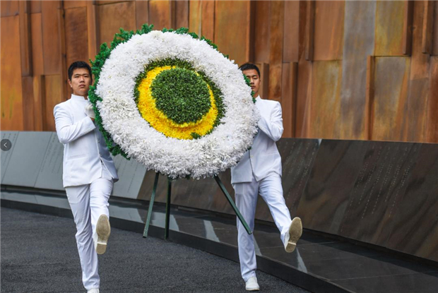 敬獻(xiàn)花籃 活動開始,兩名禮儀人員手抬花籃緩緩從烈士名單墻一側(cè)走到中央,向抗戰(zhàn)烈士敬獻(xiàn)花籃,全體人員默哀。