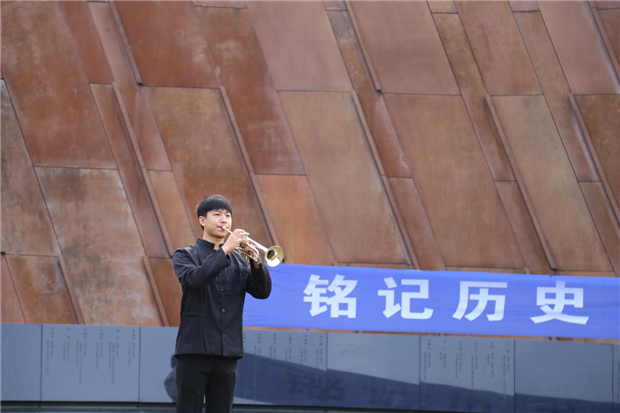全體人員默哀 隨后,小號手徐偉寧吹響《南京記憶》,他是南京藝術(shù)學(xué)院音樂學(xué)院小號專業(yè)研究生,曾多次在紀(jì)念館活動中演奏小號。這位1997年出生的南京小伙說:“作為南京人,我從未有一刻忘記過那段屈辱的歷史,小時候父母就帶我來紀(jì)念館參觀過。如今我希望通過小號演奏,用富有穿透力的音樂聲,向全世界表達(dá)我們反對戰(zhàn)爭,熱愛和平的心聲。”