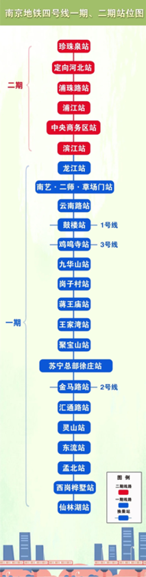 在站點設(shè)置上,4號線二期工程起于一期工程龍江站,向西下穿長江夾江、江心洲、潛洲和長江干線后,沿定山大街、浦烏路敷設(shè),止于珍珠泉站,線路全長約10公里,沿線行經(jīng)鼓樓區(qū)、建鄴區(qū)(江心洲)和江北新區(qū),共設(shè)車站6座,均為地下站,分別為珍珠泉站、定向河北站、浦珠路站、浦江站、中央商務(wù)區(qū)站和濱江站。