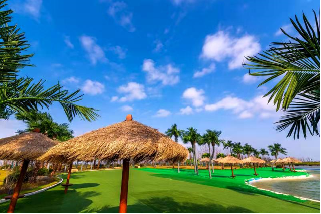 江海文化景觀大道 “運氣好的話,你在這里可以看到三水交匯的奇觀;對面可以看到崇明島,這里也是海上看日出的網(wǎng)紅打卡地!闭驹凇敖玻V^”一個石碑前,啟東圓陀角旅游度假區(qū)委會黨群局局長龔紅宇將手指向石碑45度方向說,“我們度假區(qū)最大的資源特色,就是它既靠江也靠海,這里是長江入?,然后以長江為界限,北邊是黃海,南邊是東海,度假區(qū)的江堤和海岸形成一個角,三水交匯的地方像一個圓陀角,所以取名為圓陀角旅游度假區(qū)! 圓陀角旅游度假區(qū)是啟東重點開發(fā)、打造的又一個以文旅為特色的旅游度假區(qū),度假區(qū)里引進了恒大海上威尼斯項目和新湖長江公園項目。恒大海上威尼斯項目總占地面積9000多畝,規(guī)劃打造一個集酒店住宿、會議會展、文化娛樂、體育運動、養(yǎng)生保健以及度假人居等功能于一體的大型濱海度假綜合體。截至目前,該項目已累計完成投資200多億元,威尼斯酒店、國際會議中心、飲食中心、運動中心、兒童歡樂中心等九大中心以及四星級酒店、美食一條街等旅游設施已建成并對外開放。依托濱江臨海的區(qū)位優(yōu)勢和獨特的江海旅游資源,恒大海上威尼斯已成為長三角地區(qū)一個新興的旅游度假目的地。新湖長江公園整體項目還在火熱建設中,但郁金香花海等景點已經(jīng)對外開放。