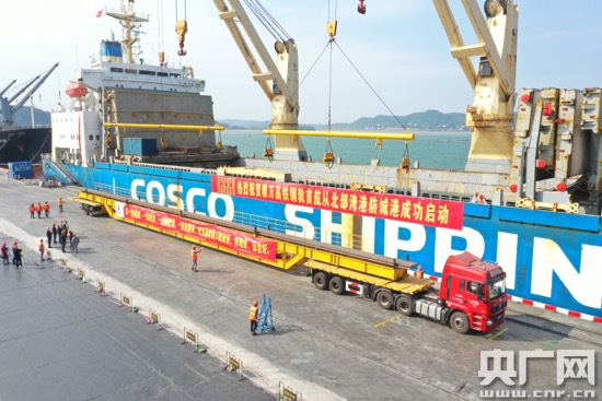 防城港碼頭(央廣網(wǎng)發(fā) 通訊員陳磊 攝) 央廣網(wǎng)防城港11月29日消息(記者鄧君洋 通訊員宋斯麗 陳潔)11月28日上午,隨著一聲鳴笛,一根50米長的鋼軌被緩緩吊上油輪,標(biāo)志著我國高鐵“整體出口”的第一單——印尼雅萬高鐵出海的第一批鋼軌在防城港碼頭首航成功,這也標(biāo)志著中國成為全球?yàn)閿?shù)不多可進(jìn)行長定尺鋼軌出口的國家之一。 中國與印度尼西亞合作建設(shè)的雅萬高鐵全長142.3公里,是東南亞第一條最高設(shè)計(jì)時速350公里的高鐵。據(jù)了解,雅萬高鐵項(xiàng)目所需鋼軌在2020年1月底確定由攀鋼集團(tuán)有限公司(以下簡稱“攀鋼”)生產(chǎn)制作。