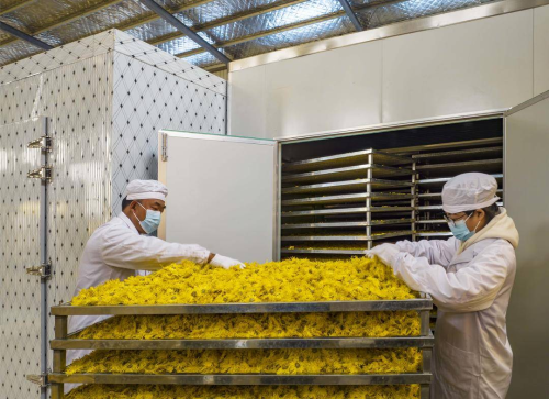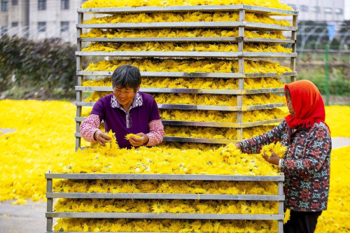 今年夏季,當(dāng)?shù)剞r(nóng)民在收獲油菜后種植了450畝的婺源皇菊和金絲皇菊。村民們穿梭在“花海”之中,趁著晴好天氣采摘成熟的花朵,再進行烘烤、銷售,田間地頭一派繁忙的豐收景象。 |