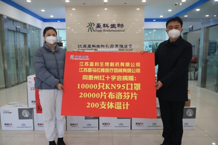 23日上午,江蘇盈科生物制藥有限公司及旗下子公司江蘇喜馬拉雅醫(yī)療器械有限公司,向泰州紅十字會捐贈一批防疫急需物資,包括1萬只KN95口罩、2萬顆布洛芬片和200支體溫計。