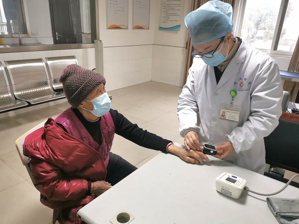 1月14日下午,在靖江市城南辦事處江澄苑社區(qū)衛(wèi)生服務(wù)中心不時有前來配藥、量血壓、做血氧檢測的居民。自從得知衛(wèi)生服務(wù)中心配備了4臺脈氧儀后,前來進(jìn)行血氧飽和度檢測的居民就越來越多。80歲的陳鳳珠老人“陽康”后時有胸悶氣短的感覺,醫(yī)務(wù)人員第一時間給老人做了檢測,“醫(yī)生們都很熱情,我感覺有點不舒服會過來讓他們幫忙檢測,就在家門口很方便,測一下自己也放心。”