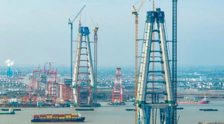 2022年,該園區(qū)全年地區(qū)生產(chǎn)總值118億元,同比增長5.6%;開票銷售750億元,同比增長9%;規(guī)上工業(yè)產(chǎn)值234億元,同比增長11.9%。 “企業(yè)在跨江融合發(fā)展過程中,不僅僅在產(chǎn)業(yè)轉移的過程中獲得了新的資源、新的平臺和新的發(fā)展空間,企業(yè)的產(chǎn)業(yè)層次、發(fā)展能力也獲得了新的提升。”揚子江造船相關負責人表示。 奮勇爭先 ,跨江聯(lián)動“樞紐”示范 對泰州而言,“跨長江”是一個傳承千年的夢想。年輕的泰州,正以后起之秀之勇氣,以跨江融合發(fā)展為目標,統(tǒng)籌規(guī)劃、完善布局,加密過江通道建設,加快構建現(xiàn)代綜合交通運輸體系。 2023年2月1日,隨著2500噸浮吊船4個主鉤緩緩升起,重達1400噸的大節(jié)段鋼梁穩(wěn)穩(wěn)安放于滑移支架,常泰長江大橋主航道橋首個大節(jié)段鋼梁吊裝完成。 2023年2月3日,江陰靖江長江隧道建設進度邁出了重要一步,“匠心一號”大型盾構機已成功抵達長江南岸,在它一側,“聚力一號”盾構機也在全速推進,喜迎3000米掘進大關。 2023年2月9日,張靖皋長江大橋ZJG-C1標段南航道橋南主塔制造正式開工,標志著世界最高懸索橋鋼塔制造進入施工階段。