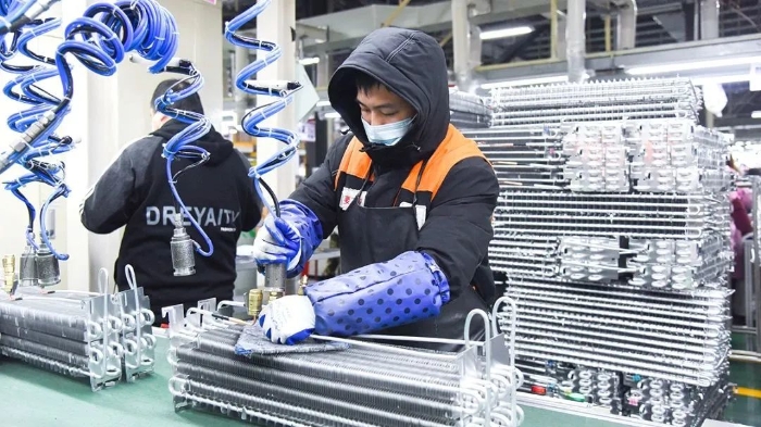作為海陵智慧家電產(chǎn)業(yè)鏈的鏈主企業(yè),2022年樂金電子實現(xiàn)工業(yè)開票銷售93億元,“鏈”起本地配套企業(yè)突破30家,產(chǎn)業(yè)鏈規(guī)模超150億元,其中17家已成為規(guī)上企業(yè),涵蓋主控板、電機、壓塑機零部件等產(chǎn)品,產(chǎn)業(yè)鏈條完整。 蒸發(fā)器和冷凝器是空調(diào)、冰箱等制冷設(shè)備中的重要部件。位于海陵工業(yè)園區(qū)的泰州仕達利恩電子有限公司是一家韓國獨資企業(yè),主要生產(chǎn)銷售片式元器件、光電子器件及冰箱零配件。步入生產(chǎn)車間,產(chǎn)品通過傳送帶送到每個工序,一條生產(chǎn)線近30名工作人員配合默契。“我們目前有13條生產(chǎn)線,年產(chǎn)蒸發(fā)器冷凝器500萬套。2022年,企業(yè)實現(xiàn)工業(yè)開票銷售4.89億元。”公司管理部科長樸成介紹。