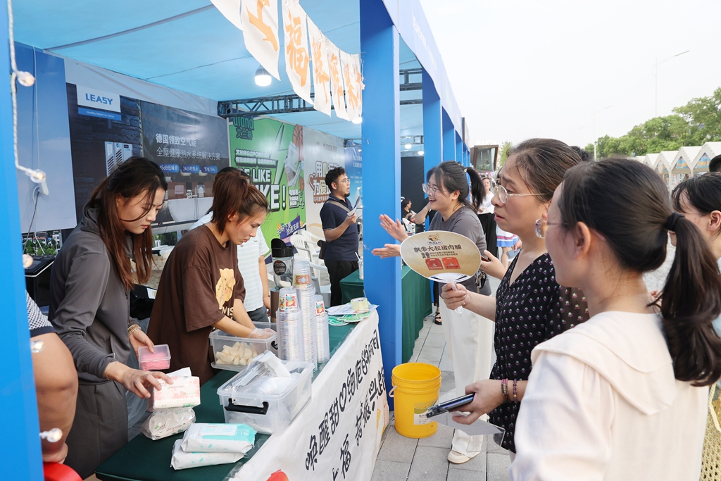 在賽場南側(cè),一字排開的“夏日晚風(fēng)市集”吸引了不少前來觀賽的市民。“帶過來100斤梨,沒1小時(shí)就賣光了,現(xiàn)正聯(lián)系人緊急送貨。”走進(jìn)一家鮮榨果汁攤位,東興鎮(zhèn)旺稼村村干楊旭輝正在忙著削梨、榨梨,他說,今天帶來的現(xiàn)榨翠冠梨均由村內(nèi)種植戶提供,起初是想幫種植戶分?jǐn)傸c(diǎn)銷量,但沒想到生意這么紅火。體彩攤位前,同樣擠滿了前來“碰運(yùn)氣”的市民。銷售員王晶介紹,這次帶來的彩票以刮刮樂為主,開業(yè)1小時(shí)就賣出去三四十張了,大家購買彩票的熱情也因?yàn)榛@球賽事而顯得十分高漲。
