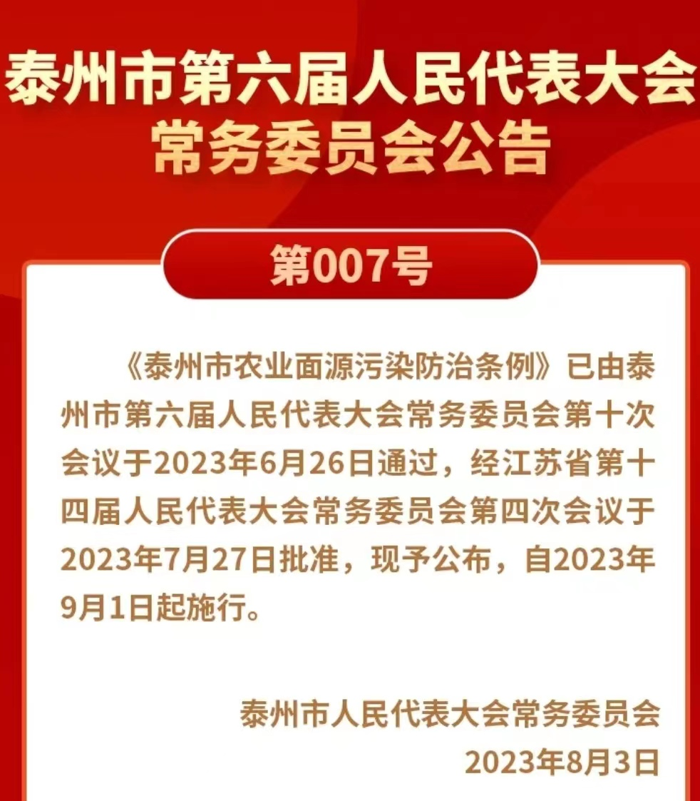 泰州市用法治路徑保護生態(tài)環(huán)境,全省首部農業(yè)面源污染防治條例9月起施行