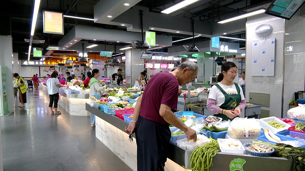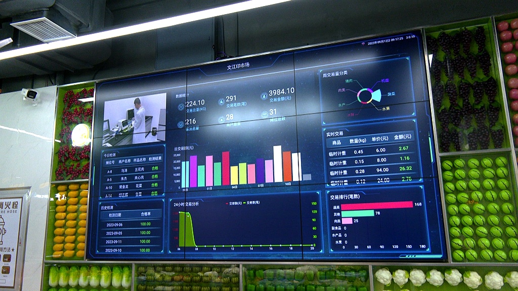 近日,記者來到泰興市文江印智慧生鮮市場,位于菜場入口處的智慧管理總覽屏正實時顯示著市場客流量、交易數(shù)據(jù)以及農(nóng)產(chǎn)品農(nóng)藥殘留檢測數(shù)據(jù)等。據(jù)了解,該市場于今年7月建成運營,共設(shè)肉類、蔬菜、水產(chǎn)、貝類、水果、預(yù)制菜等攤位31個。市場內(nèi),干凈整潔、燈光明亮,正常開放的中央空調(diào),給市民帶來清涼、舒適的購物體驗。“肉類、蔬菜類等食材,都很新鮮,品種也齊全。而且這兒的環(huán)境不錯,比較干凈。”市民陳智陽說。