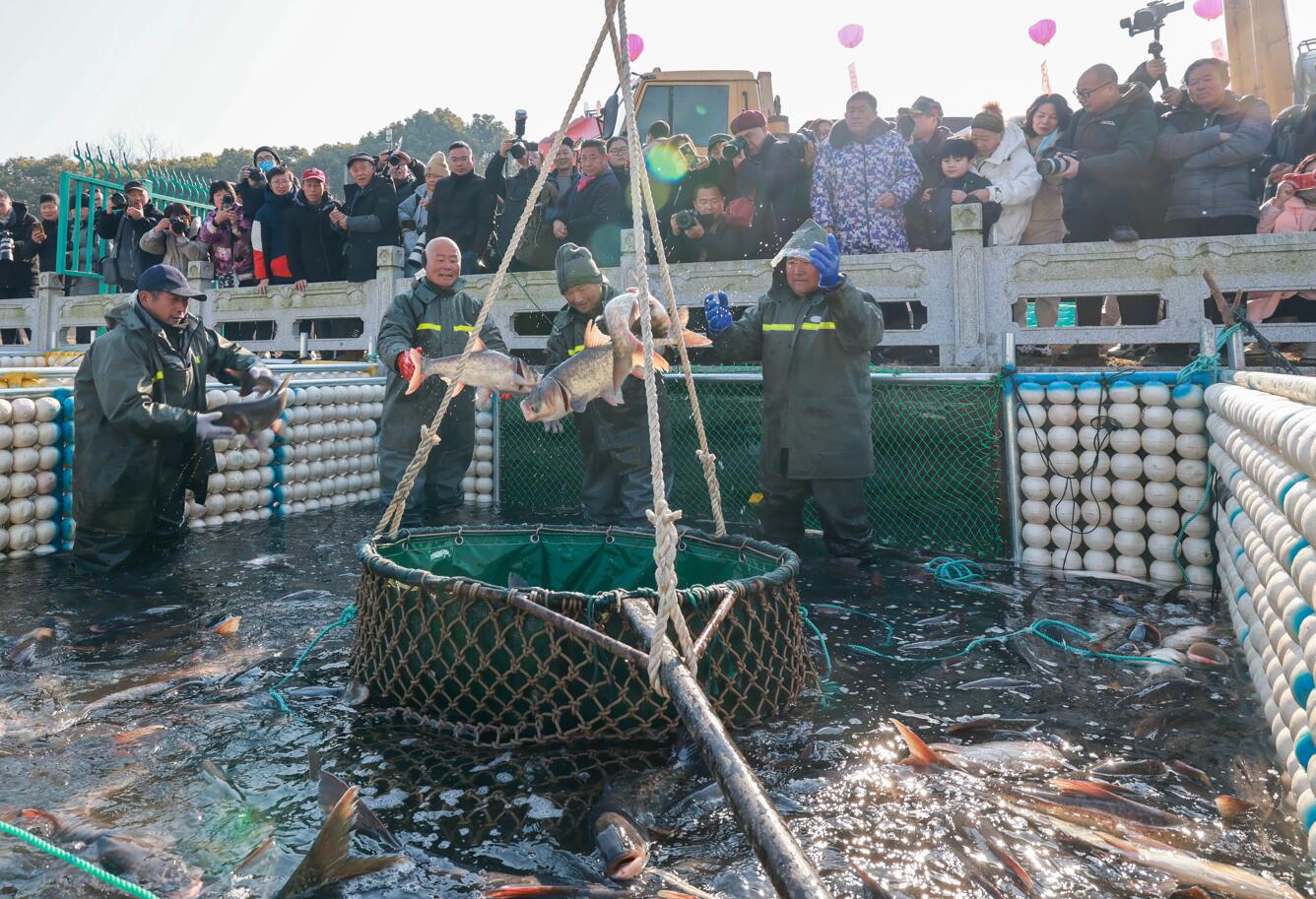 “起魚啦!” 1月27日上午,伴隨著吆喝聲,肥美的鰱魚、花魚、鯉魚在大網(wǎng)中活蹦亂跳,十里溱湖人歡魚躍,濺起串串水花,引得游客爭相拍照。不少游客第一時間開啟抖音直播,將泰州市姜堰區(qū)溱湖冬捕的歡騰場景分享給全國各地網(wǎng)友。從2018年起,一年一度的溱湖冬捕從未間斷,人們用冬捕的方式來慶祝一年的豐收,喜迎新春的到來。 今年冬捕的主題是“龍騰大澤,漁悅溱湖”,期望新年討個好彩頭,生活越過越紅火。 溱湖位于江蘇里下河腹地,以水質(zhì)清純、物產(chǎn)豐富、風(fēng)景秀麗著稱,是“水韻江蘇”的典型代表。 “捕魚在很多人眼里看似簡單的活兒,但在6000畝的溱湖水面上捕魚,絕非易事。它不同于查干湖冰面上捕魚,原始捕魚的方式,讓當(dāng)?shù)厝苏业搅艘郧暗目鞓贰?rdquo;溱湖文旅集團(tuán)總經(jīng)理肖娟娟說。 “趕魚”。記者了解到,這幾年冬捕,專門從外地趕來的專業(yè)捕魚隊和捕魚高手,同溱湖周邊的村民一道,半個月前就下網(wǎng)撈魚,將寬闊水域里的魚兒驅(qū)趕到特定的區(qū)域,便于集中捕撈。 “下網(wǎng)”。記者在現(xiàn)場看到,包魚的大網(wǎng)由兩邊的動力船緩緩地向前拉,網(wǎng)里的魚兒很是興奮,成群結(jié)隊躍出水面,構(gòu)成了一幅“豐收圖”。 “起網(wǎng)”。漁網(wǎng)漸漸收攏,鬧騰的魚群頓時像炸開了鍋,“撲通撲通”的聲音不絕于耳,水下的魚兒仿佛也要躍上水面,看看這大美溱湖的景色,瞅瞅岸邊歡樂的人群。 “起運”,F(xiàn)場的捕魚大師將一條條大魚逮進(jìn)網(wǎng)兜,由吊車起運上岸。一網(wǎng)兜魚足有一千多公斤,十多條“巨無霸”令人嘖嘖稱贊。捕魚師傅告訴記者,這次捕獲了一條49.13公斤的鳡魚,是今年冬捕的“魚王”,并以5.8萬元的價格被本地餐飲企業(yè)買走。 承載的是豐收的喜悅,寄托的是對新年的祝福。此次冬捕,直播盛況火力全開,省內(nèi)外近30家媒體長槍短炮記錄了冬捕精彩瞬間。自助烤魚、燉魚湯、拍賣魚王、簽訂合作協(xié)議……活動接連不斷。 “今年冬捕與往年有什么不一樣?” “溱湖冬捕,我一次沒落下,今年冬捕更有看頭,不僅有國內(nèi)游客,還有外國友人在現(xiàn)場參與烤魚教學(xué),可見溱湖冬捕的知名度已經(jīng)走向了世界。”來自浙江的旅游達(dá)人小黑向記者說了他今年的感受。 十里溱湖魚蝦美,春生夏長冬捕忙。據(jù)介紹,溱湖冬捕將一直持續(xù)到春節(jié)前,捕魚總量預(yù)計達(dá)到25萬公斤,同時還將在線上線下開啟溱湖年貨大集市,舉行魚苗放養(yǎng)儀式,計劃放養(yǎng)4萬公斤魚苗。這場冬捕,漁網(wǎng)碰撞出的是豐收的火花,人們收獲的是幸福的年景。 |