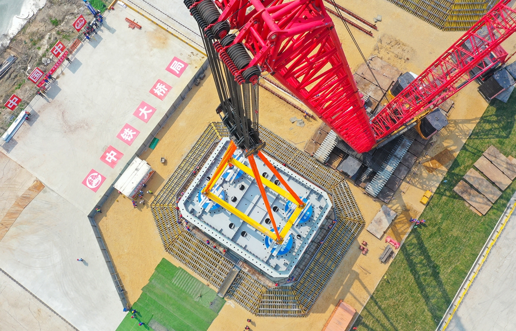 “主塔首節(jié)段安裝主要有兩個(gè)難點(diǎn),一是如何將720噸的龐然大物運(yùn)輸?shù)街付ㄎ恢谩6前惭b精度要求極高!睆埦父揲L江大橋ZJG-A2標(biāo)項(xiàng)目生產(chǎn)副經(jīng)理郁文介紹,首節(jié)段施工通過166根錨桿將混凝土塔座和鋼混主塔緊緊錨固在一起,實(shí)現(xiàn)兩者的緊密連接。3月16日,在海事、航道等多部門的精心保障下,北主塔首節(jié)段實(shí)現(xiàn)了精準(zhǔn)就位,整個(gè)吊裝過程耗時(shí)近3小時(shí)。在錨桿安裝中,166根錨桿水平偏位均控制在了2毫米以內(nèi)、垂直度達(dá)到了1/4000;首節(jié)段鋼塔內(nèi)有上下兩層圓孔,最小圓孔直徑160毫米,鋼塔圓孔在廠內(nèi)經(jīng)過精密加工,確保140毫米錨桿絲頭精準(zhǔn)穿過兩層鋼板圓孔。