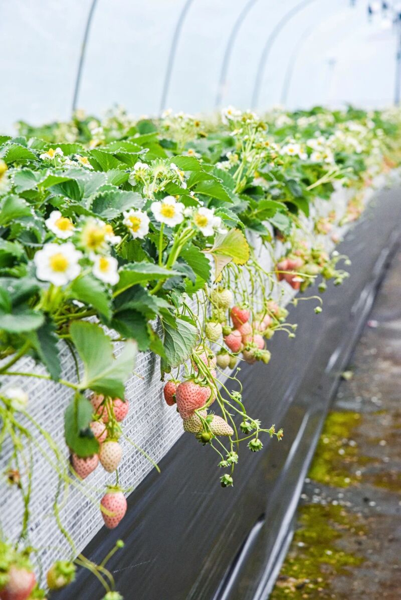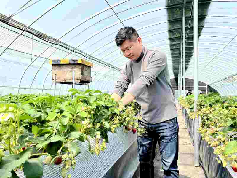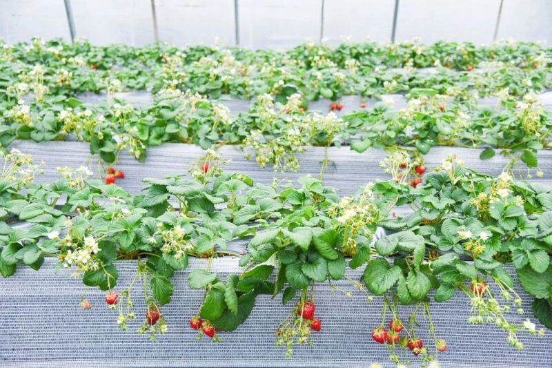 “立架高栽是一種新的栽培模式,不用彎腰,省工省力、清潔輕便、綠色高效。”徐洪介紹,傳統(tǒng)栽培草莓的土壤中容易滋生病菌,發(fā)生土傳病害。立架高栽采用的是專用草莓種植基質(zhì),杜絕了土傳病害的發(fā)生。園內(nèi)草莓苗自帶營養(yǎng)基質(zhì),可減少病害發(fā)生的可能。此外,還在草莓葉表面均勻鋪撒一些細小的木屑,木屑中混入了肉眼看不到的捕食螨。利用捕食螨“以蟲治蟲”,減少了農(nóng)藥的使用。 周康偉介紹,草莓大棚里采用了水肥一體機,將水和營養(yǎng)液通過滴灌系統(tǒng),均勻送入種植基質(zhì),節(jié)水節(jié)肥節(jié)約人力,還能科學地給每棵植株提供均衡營養(yǎng),使草莓的生長發(fā)育始終處于最佳狀態(tài),促進果實品質(zhì)的提高。