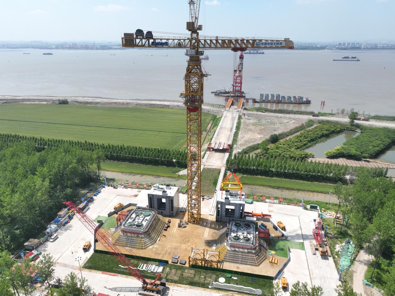 世界最大塔式起重機(jī)在靖江“登島”安裝,張靖皋長(zhǎng)江大橋南航道橋北主塔進(jìn)入“堆高”新階段